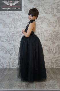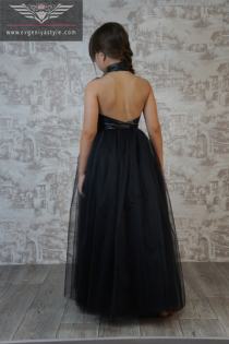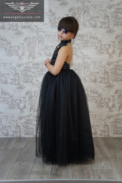 Пышное платье с кожаным лифом и открытой спиной, по спинке застежка запахом, для легкой регулировки ширины изделия по ребенку. Если ваш ребенок немного поправится или похудеет, то достаточно перешить одну кнопку по спинке и платье будет четко сидеть по фигуре.