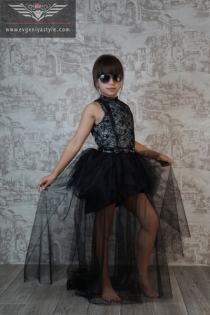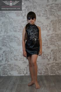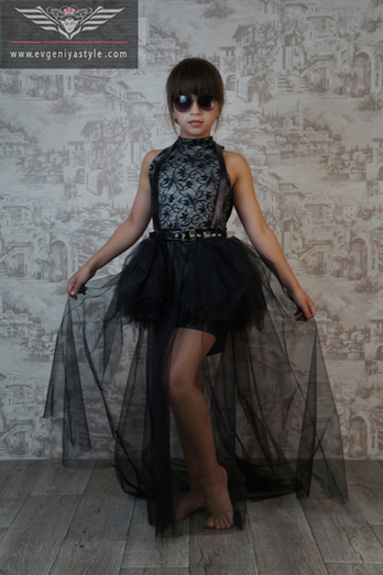 Платье состоит из двух вещей: элегантного платья футляр и пышной экстравагантной юбки. Платье футляр выполнено из кружевного лифа и кожаной юбки, по спинке застежка - запахом, для легкой регулировки ширины изделия по ребенку. Если ваш ребенок немного поправится или похудеет, то достаточно перешить одну кнопку по спинке и платье будет четко сидеть по фигуре.
