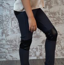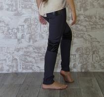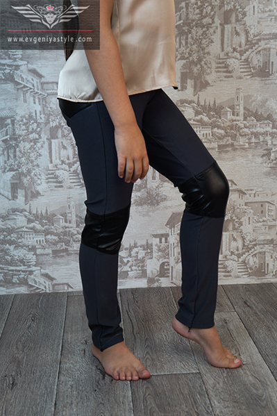 Брюки из серого футера, с отделкой из черной кожи. На коленях модные кожаные вставки, по спинке накладные карманы из кожи. Брюки удобные в носке и выглядят очень эффектно. Их можно носить с заправленной блузой и ремешком.
