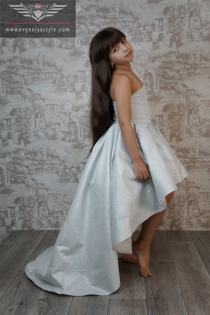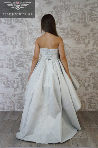 Платье идет с жестким корсетом на шнуровке и ассиметричным низом.